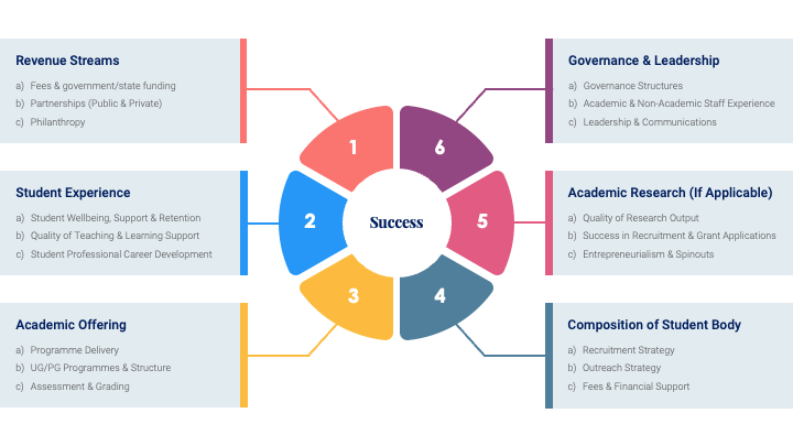 Our model below provides an outline roadmap for other institutions to work with. The starting point is that there is no urgent need for a complete existential re-thinking of what a university is. Success can follow on performing the core functions of a traditional university well. This is not to say that innovation cannot be effective – it has always in fact been at the heart of what universities are – but rather that complete re-invention is not called for.